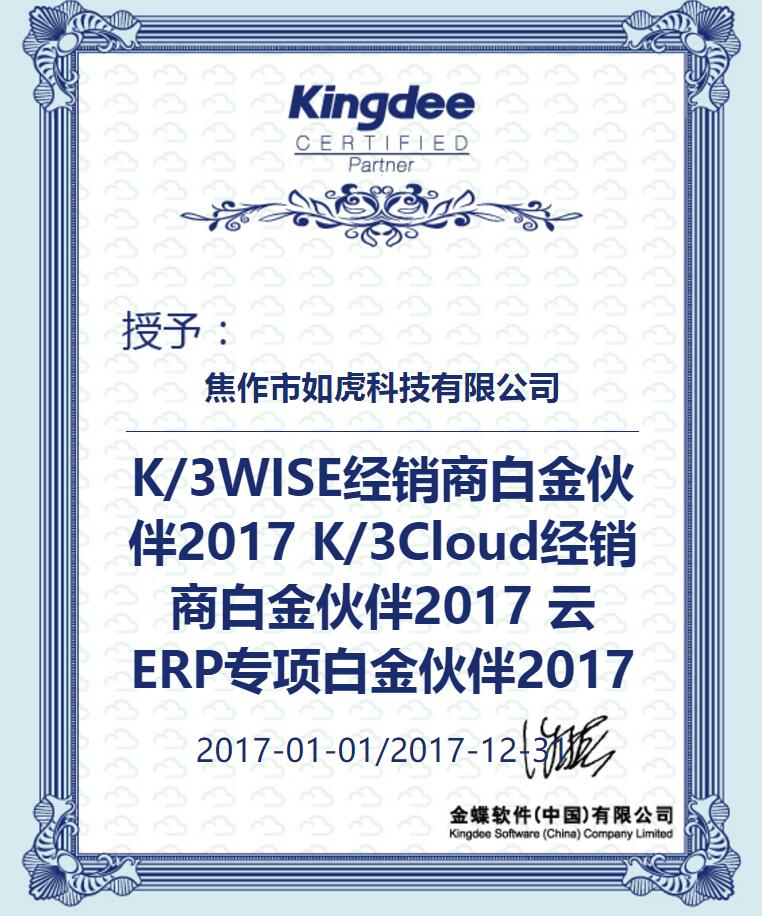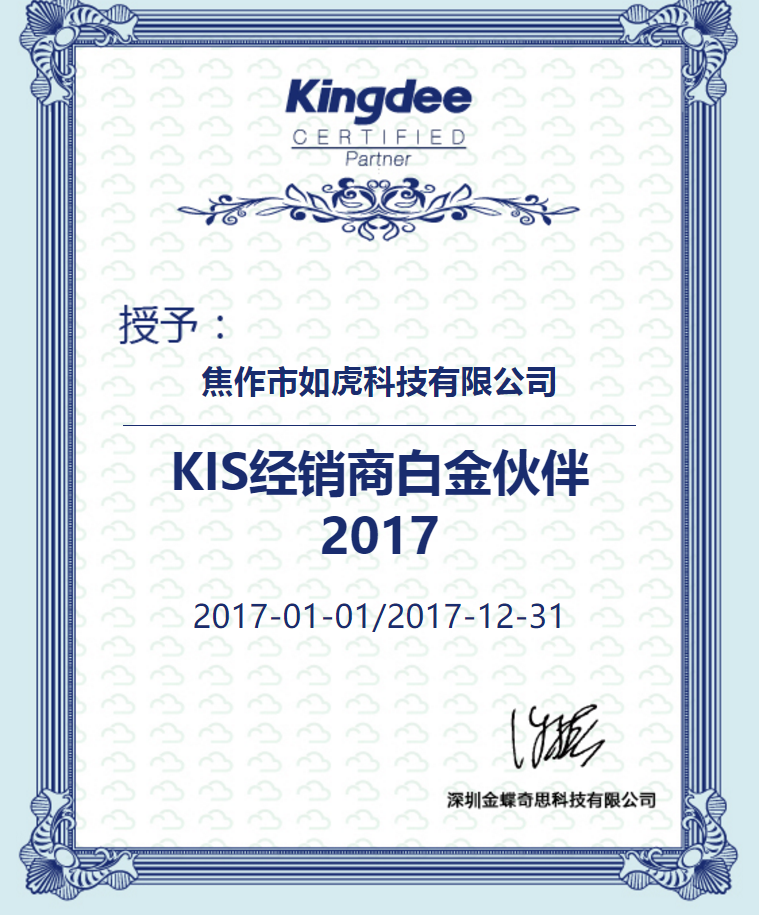 恭賀我公司簽約金蝶軟件2017年白金合作伙伴